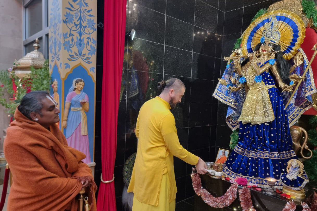 After Navaratri 2022, shortly after becoming a brahmacārī, Swami Kuru asked, “Do you want to be a pūjārī of Rādhā-Durgā?” Vrishakapi instantly agreed, and Guruji approved.
